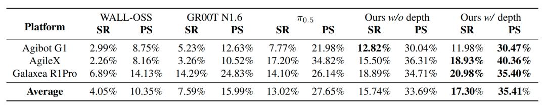 在综合了任务成功率和进度得分两项核心指标后,LingBot-VLA(无深度版本)已在三项指标上全面领先WALL-OSS与GR00T N1.6。