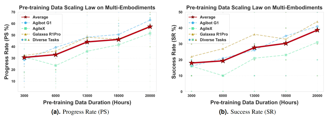 从3000小时到20000小时,首次在真实世界场景中,系统性地验证了VLA模型性能会随着数据规模扩大而持续提升的Scaling Law。