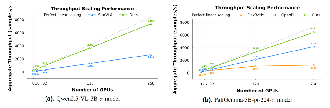 在8卡GPU的配置下,LingBot-VLA代码库实现了每秒每GPU 261个样本的吞吐量;与社区主流的OpenPI、StarVLA等框架相比,训练速度提升了1.5倍至2.8倍。